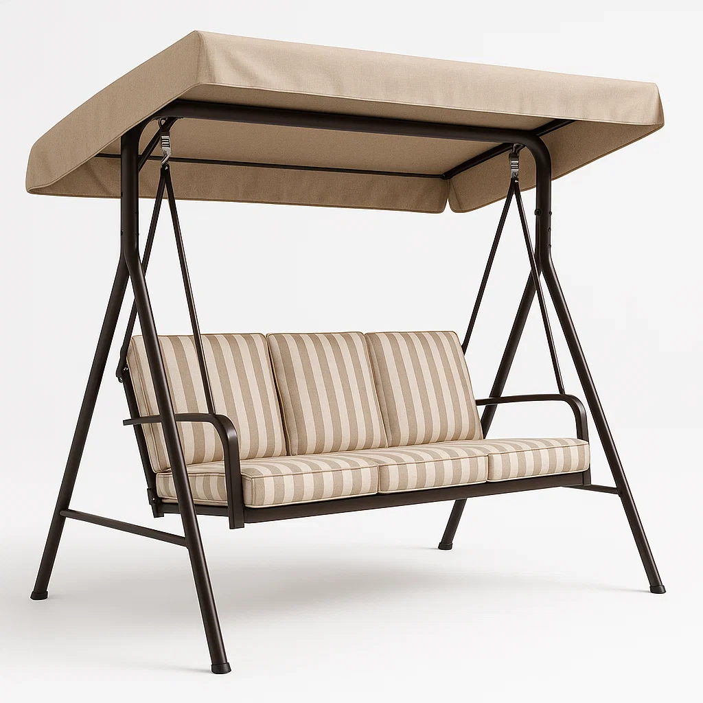 Columpio de jardín metálico marrón con cojines de poliéster rayas beige 3 plazas