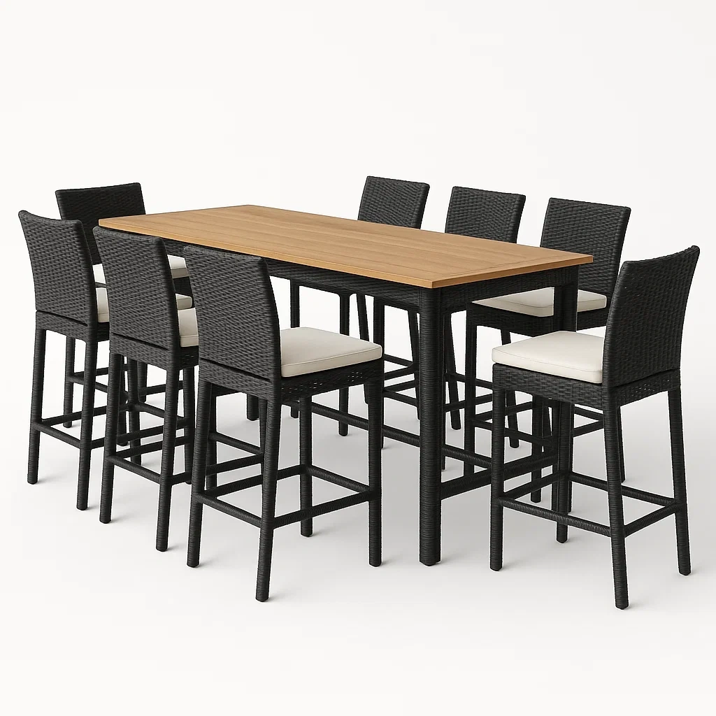 Material: Superficie de la mesa de madera de teca, estructura de ratán sintético, cojines de espuma con funda de poliéster.