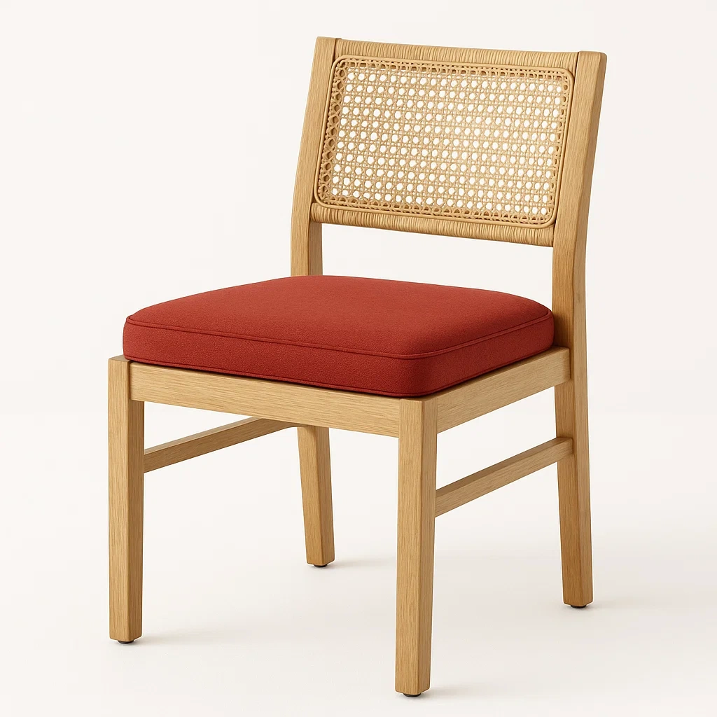 Silla de comedor de madera con respaldo de rattan y cojín rojo